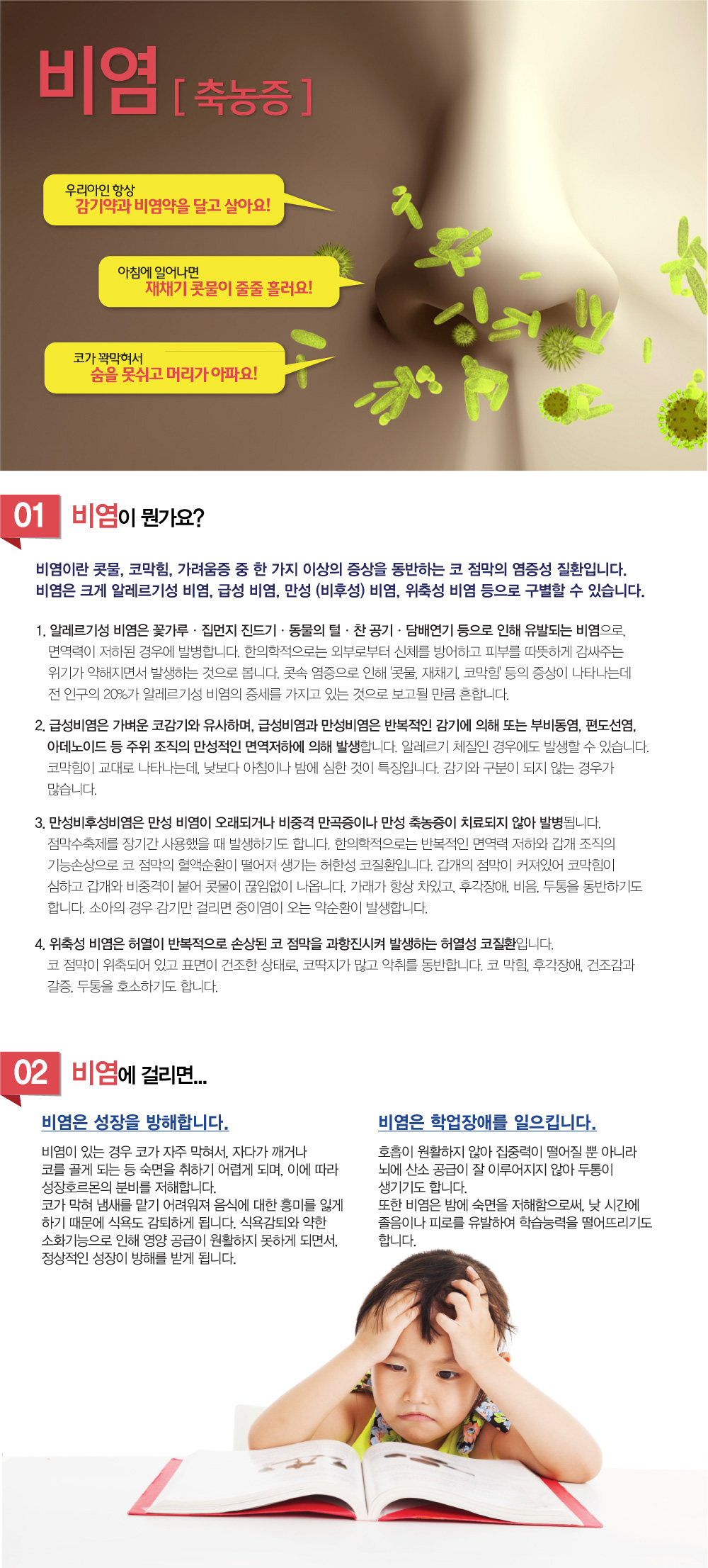 제목 : 해아림한의원 알레르기 비염, 알러지 비염, 축농증 클리닉 내용 : 알레르기 비염, 알러지 비염, 축농증 치료 전문적인 클리닉을 찾으신다면 해아림한의원 클리닉이 있습니다. 한방신경정신과 박사, 전문의등 여러전문가들의 축농증 알레르기 비염, 알러지 비염 치료 노하우 - 해아림한의원 클리닉입니다. 알레르기 비염, 알러지 비염, 축농증 한의원 진료실에서 많이 듣는 이야기가 있습니다. 축농증 알러지비염 전문병원을 찾고 있어요. 알러지 비염이란 무엇인가요? 비염과 감기의 차이는 무엇인가요? 알레르기 비염의 주요 원인은 무엇인가요? 비염 완치가 가능한가요? 비염 치료방법은 무엇인가요? 만성 비염과 급성 비염의 차이는 무엇인가요? 비염 예방을 위해 어떤 생활습관이 필요한가요? 비염을 예방하기 위한 가장 효과적인 방법은 무엇인가요? 알러지 비염 완치가 가능한가요? 알레르기 비염 치료하려는데 비염 치료 잘하는 병원, 추천이나 비염 한의원 소개해주세요. 굉장히 많이 듣는 질문인데요. 알레르기 비염, 축농증, 알러지 비염 증상에 대해 알아보겠습니다. 우리아이는 항상 감기약과 비염약을 달고 살아요. 아침에 일어나면 재채기 콧물이 줄줄 흘러요. 코가 막혀서 숨도 못쉬고 머리가 아파요. 알레르기 비염, 알러지 비염 증상은 무엇인가요? 비염이란 콧물, 코막힘, 가려움증 중 한 가지 이상의 증상을 동반하는 코 점막의 염증성 질환입니다. 비염은 크게 알레르기성 비염, 급성 비염, 만성 (비후성) 비염, 위축성 비염 등으로 구별할 수 있습니다. 1. 알레르기성 비염은 꽃가루ㆍ집먼지 진드기ㆍ동물의 털ㆍ찬 공기ㆍ담배연기 등으로 인해 유발되는 비염으로, 면역력이 저하된 경우에 발병합니다. 한의학적으로는 외부로부터 신체를 방어하고 피부를 따뜻하게 감싸주는 위기가 약해지면서 발생하는 것으로 봅니다. 콧속 염증으로 인해 '콧물, 재채기, 코막힘' 등의 증상이 나타나는데 전 인구의 20%가 알레르기성 비염의 증세를 가지고 있는 것으로 조사될 만큼 흔합니다. 2. 급성비염은 가벼운 코감기와 유사하며, 급성비염과 만성비염은 반복적인 감기에 의해 또는 부비동염, 편도선염, 아데노이드 등 주위 조직의 만성적인 면역저하에 의해 발생합니다. 알레르기 체질인 경우에도 발생할 수 있습니다. 코막힘이 교대로 나타나는데, 낮보다 아침이나 밤에 심한 것이 특징입니다. 감기와 구분이 되지 않는 경우가 많습니다. 3. 만성비후성비염은 만성 비염이 오래되거나 비중격 만곡증이나 만성 축농증이 치료되지 않아 발병됩니다. 점막수축제를 장기간 사용했을 때 발생하기도 합니다. 한의학적으로는 반복적인 면역력 저하와 갑개 조직의 기능손상으로 코 점막의 혈액순환이 떨어져 생기는 허한성 코질환입니다. 갑개의 점막이 커져있어 코막힘이 심하고 갑개와 비중격이 붙어 콧물이 끊임없이 나옵니다. 가래가 항상 차있고, 후각장애, 비음, 두통을 동반하기도 합니다. 소아의 경우 감기만 걸리면 중이염이 오는 악순환이 발생합니다. 4. 위축성 비염은 허열이 반복적으로 손상된 코 점막을 과항진시켜 발생하는 허열성 코질환입니다. 코 점막이 위축되어 있고 표면이 건조한 상태로, 코딱지가 많고 악취를 동반합니다. 코 막힘, 후각장애, 건조감과 갈증, 두통을 호소하기도 합니다. 2. 알레르기 비염, 알러지 비염이 어떤 것에도 영향을 주나요? -비염은 성장을 방해합니다. :비염이 있는 경우 코가 자주 막혀서, 자다가 깨거나 코를 골게 되는 등 숙면을 취하기 어렵게 되며, 이에 따라 성장호르몬의 분비를 저해합니다. 코가 막혀 냄새를 맡기 어려워져 음식에 대한 흥미를 잃게 하기 때문에 식욕도 감퇴하게 됩니다. 식욕감퇴와 약한 소화기능으로 인해 영양 공급이 원활하지 못하게 되면서, 정상적인 성장이 방해를 받게 됩니다. -비염은 학업장애를 일으킵니다. :호흡이 원활하지 않아 집중력이 떨어질 뿐 아니라 뇌에 산소 공급이 잘 이루어지지 않아 두통이 생기기도 합니다. 또한 비염은 밤에 숙면을 저해함으로써, 낮 시간에 졸음이나 피로를 유발하여 학습능력을 떨어뜨리기도 합니다. 3. 알레르기 비염, 알러지 비염 원인이 뭔가요? 왜 생기나요? 비염의 직간접적인 원인은 다양하며, 면역력을 저하시키는 다양한 조건이 바탕이 되어 발생하는 것이 보통입니다. 잦은 감기, 인스턴트 식품의 과다섭취, 잘못된 생활습관, 환경오염 등의 면역력을 약화시키는 요인이 비염의 주된 원인이 됩니다. 또한 가족력도 비염의 발생에 큰 영향을 주는 것으로 알려져 있습니다. 4. 알레르기 비염, 알러지 비염 치료 한의원에서는 어떻게 하나요? 비염을 유발시키는 병체를 크게 재채기와 맑은 분비물을 특징으로 하는 수기에 의한 것과 점막의 부종으로 인한 코막힘으로 소공이 폐쇄되어 부비강내에 분비물이 고여서 화농되었기에 이를 배출시켜야하는 종농에 의한 것, 그리고 후두점막의 분비 과다로 인해 분비물을 목으로 삼키게 되고, 소아의 경우에는 수면 중에는 고인 분비물로 인해 기침이 유발되는 담음과 탁타로 구분해서 처방을 선택하게 됩니다. 결국 비염이나 축농증을 앓는 환자의 가장 큰 